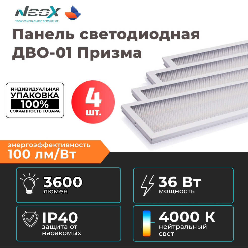 Панель светодиодная универсальная ДВО-01 3640-ПРИЗМА 36 Вт 230В 4000K 3600Лм 180х1195х19мм NEOX (4 штуки в упаковке)