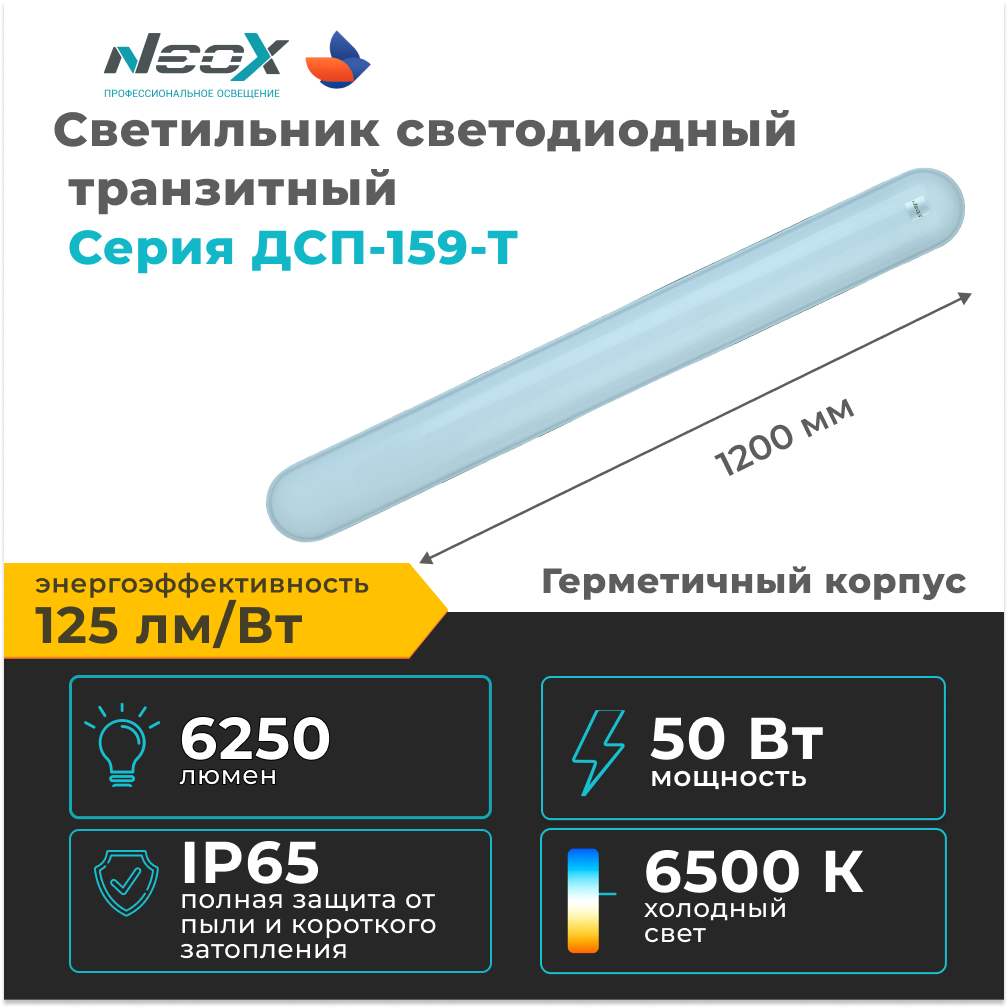 Светильник сд герметичный транзитный ДСП-159Т 50Вт 6500К 125лм/Вт 6250Лм 1200х64х60мм IP65 NEOX