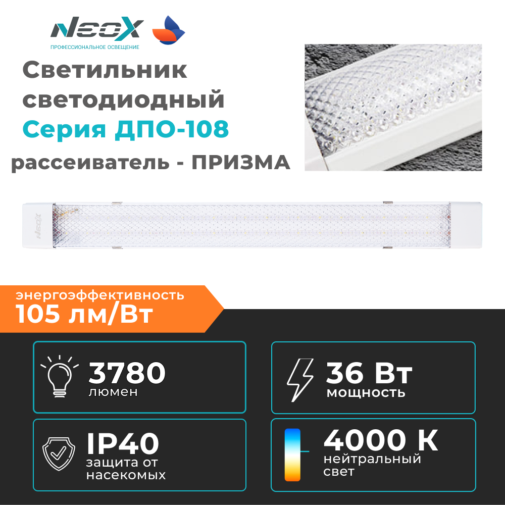 Светильник светодиодный ДПО-108 ПРИЗМА 36Вт 4000К 1200мм IP40 NEOX